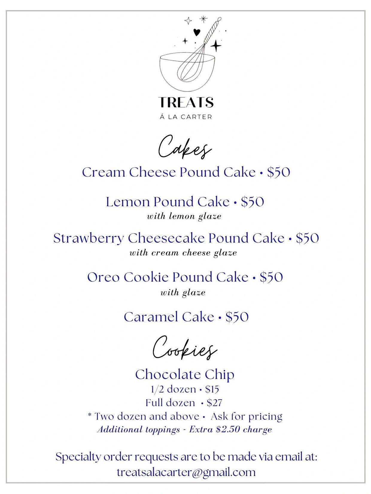 All homemade treats are made from the heart by the lovely Mrs. Treyanna Carter.